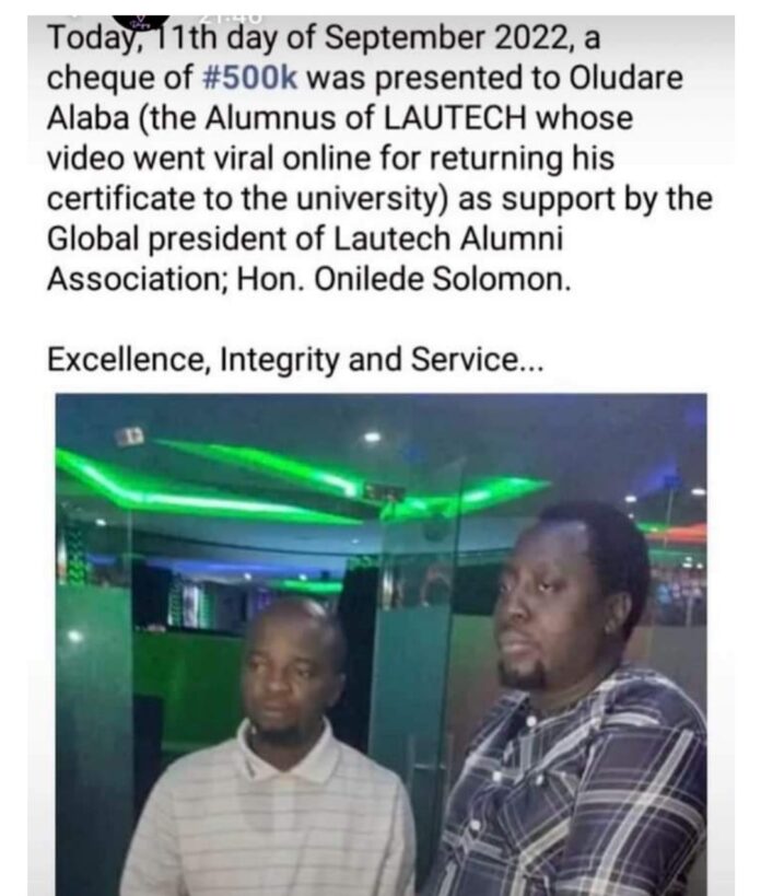 Ƙasa da mako guda da faifan bidiyon na buƙatarsa ​​mai ban mamaki ya bazu a shafukan sada zumunta, ƙungiyar tsofaffin ɗaliban jami’ar ta kawo masa dauki. A wani sabon saƙo da ya wallafa a shafinsa na Facebook, Mista Alaba ya ce ƙungiyar tsofaffin daliban ta miƙa masa chak na Naira 500,000. Yace; “Na yi amfani da wannan kafar ne domin in nuna matuƙar godiyata ga ƙungiyar Global Body of LAUTECH Alumni kamar yadda shugaban ta, Hon. Onilede Solomon wanda aka fi sani da LIMO, kwamitin amintattu na ƙungiyar reshen jihar Oyo, ya gabatar mani chekin #500,000 a yau.