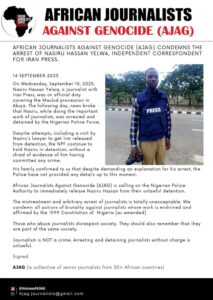 Kungiyar ‘yan jarida ta Afrika da ke yaƙi da kisan ƙare dangi (AJAG) ta yi ƙira da a gaggauta sakin Nasiru Hassan Yelwa, ɗan jaridar IRAN PRESS, wanda aka kama a lokacin da yake ɗaukar labarin zagayen Mauludi a Abuja a ranar Laraba 10 ga Satumba, 2025.