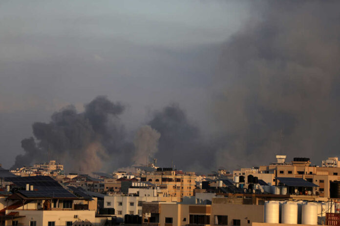 Smoke billows during Israeli strikes on Gaza City on October 10, 2023. (Photo by Majdi Fathi/NurPhoto via Getty Images)
