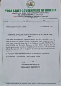Gwamnatin Jihar Yobe ta ba da umarnin a rufe dukkan makarantun sakandare na kwana a faɗin jihar nan take a matsayin matakin kariya don tabbatar da tsaron ɗalibai.
