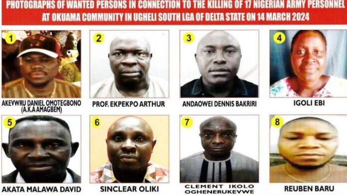 Rundunar sojojin ƙasa ta Najeriya ta fitar da hotunan wasu mutane da take nema ruwa-a-jallo bisa zargin kisan dakarunta goma sha bakwai a jihar Delta da ke kudancin ƙasar.