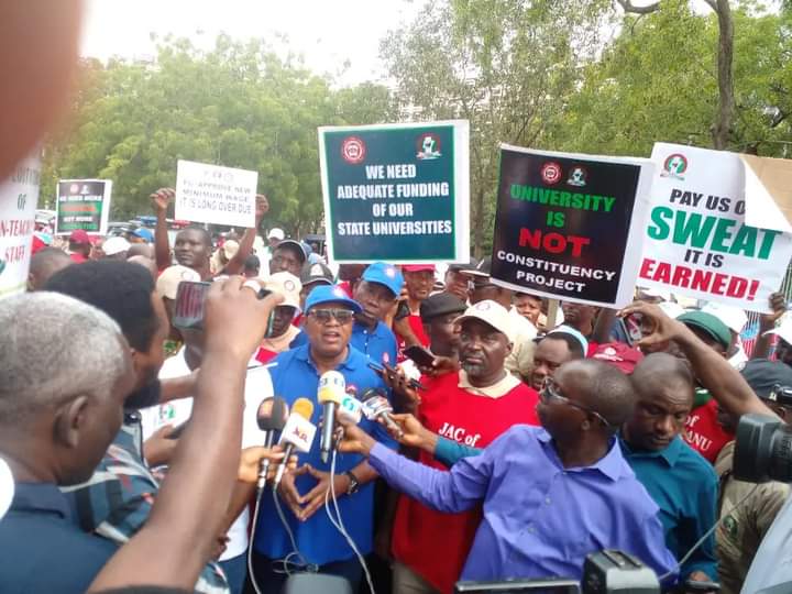 A halin yanzu dai mambobin ƙungiyar manyan ma’aikatan jami’o’in Najeriya (SSANU) da na (NASU) sun hallara a Unity Fountain da ke Abuja, suna zanga-zangar ƙin biyansu albashin watanni huɗu.