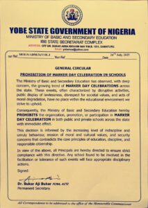 Ma’aikatar Ilimi ɓangaren babbar Sakandire ta jihar Yobe ta sanar da dakatar da gudanar da bukukuwan ‘Marker Day’ a makarantun gwamnati da masu zaman kansu a faɗin jihar nan take.